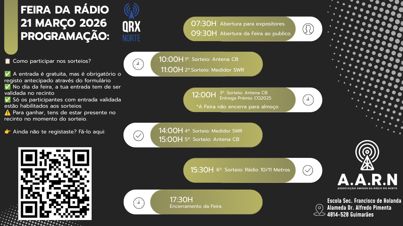O QRXNorte tem o prazer de o convidar para fazer parte do nosso próximo evento, "Feira Rádio QRXNorte/AARN 2026", (que este ano se associou à A.A.R.N para o evento).
