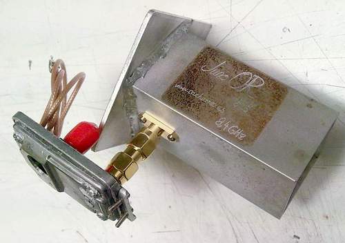 Esta es una foto del guiaondas diseñado y construido a medida para la frecuencia de datos de la sonda (tiene acoplado el convertidor obtenido de un LNB):